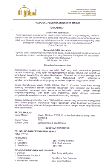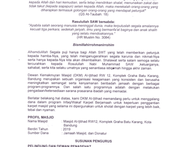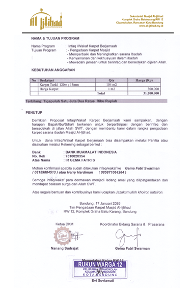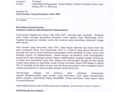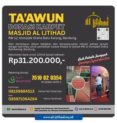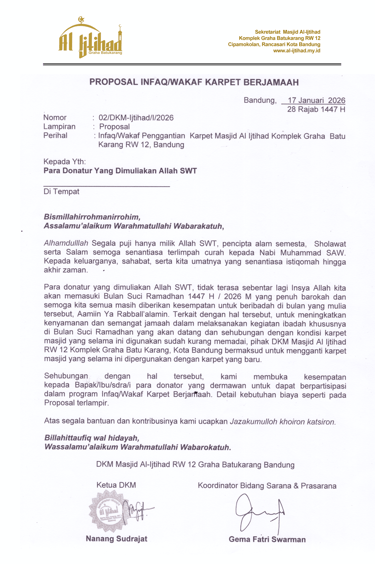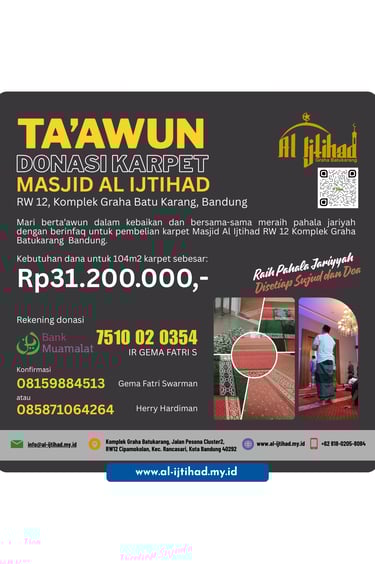 Para donatur yang dimuliakan Alah SWT, tidak terasa sebentar lagi Inshaa Allah kita akan memasuki Bulan Suci Ramadhan 1447 H / 2026 M yang penuh barokah dan semoga kita semua masih diberikan kesempatan untuk beribadah di bulan yang mulia tersebut, Aamin Ya Rabball'alamin. Terkait dengan hal tersebut, untuk meningkatkan kenyamanan dan semangat jamaah dalam melaksanakan kegiatan ibadah khususnya di Bulan Suci Ramadhan yang akan datang dan sehubungan dengan kondisi karpet masjid yang selama ini digunakan sudah kurang memadai, pihak DKM Masjid Al ljtihad RW 12 Komplek Graha Batu Karang, Kota Bandung bermaksud untuk mengganti karpet masjid yang selama ini dipergunakan dengan karpet yang baru.